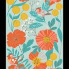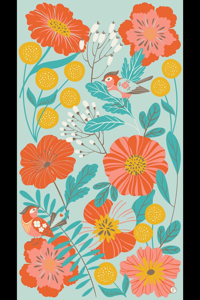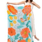 The print of jazzy abstract poppies and adorable lovebird in orange, gold, coral and teal really pop against the delicate aqua background. This is a real statement scarf, large enough to wrap around your shoulders and soft enough to loop around the neck, making it both useful and practical.