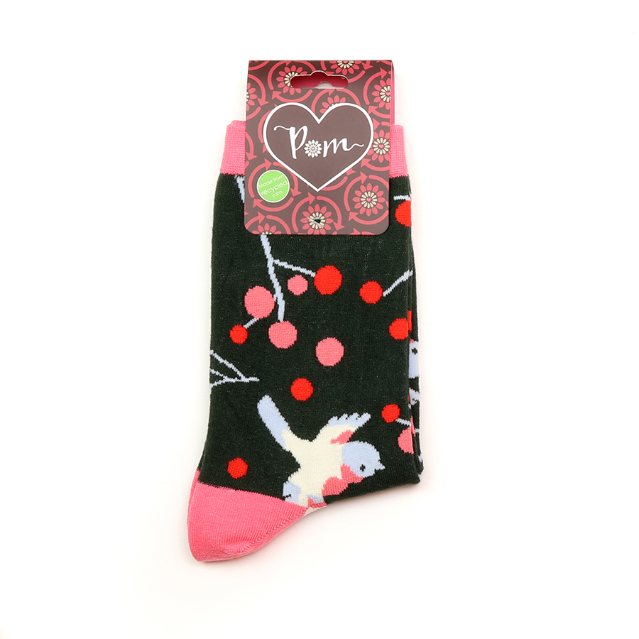 These cute cotton love bird socks are just the thing to cheer up your footwear this spring. With a lovely design of assorted coloured cherries on branches with the sweetest little love birds flying amongst them, on a dark green background.