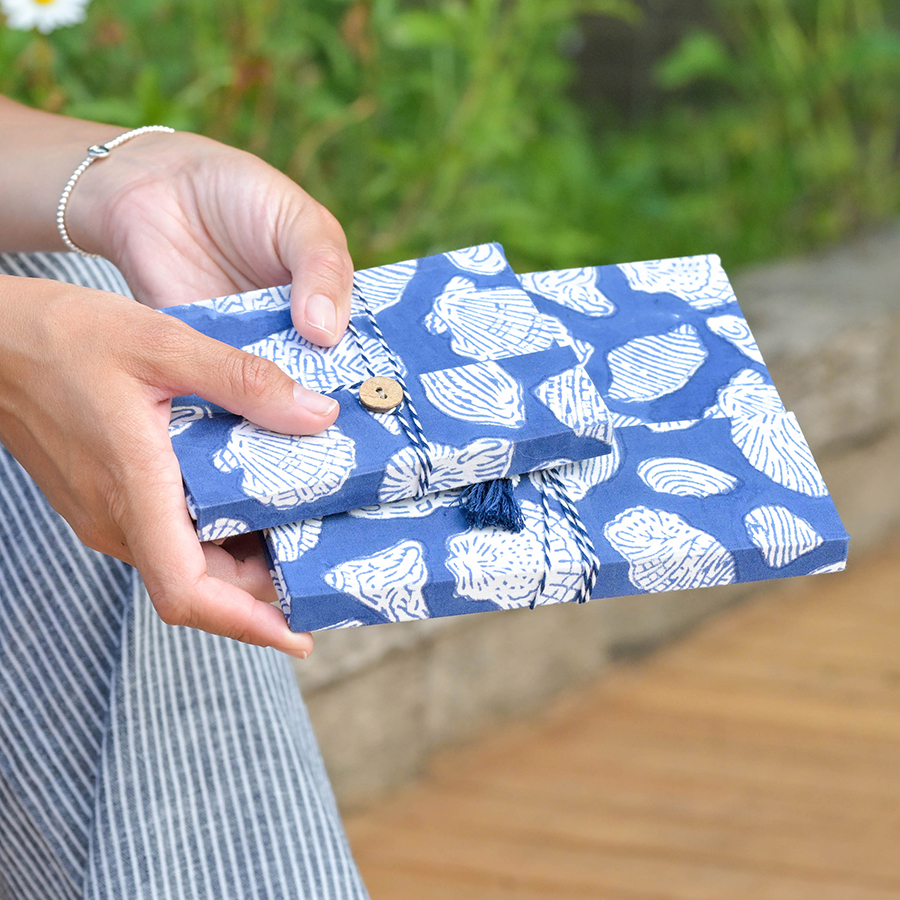 This blue shell notebook set, with its beautiful block printed cotton cover is perfect for all your creative needs. A set of two different sized notebooks covered in handblock printed cotton fabric offering practicality and uniqueness.