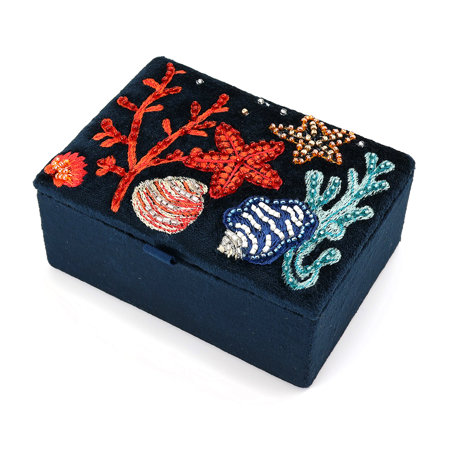The moody navy coloured velvet of this embroidered sealife jewellery box is a stylish colour and makes a striking background for the embroidered detail.