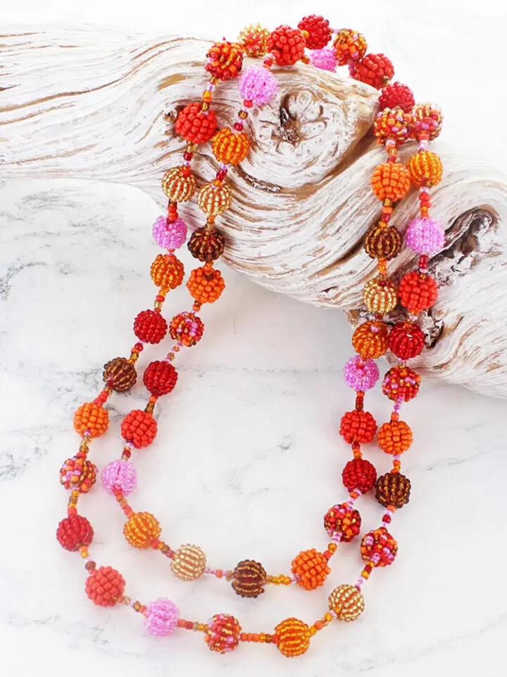 Featuring a string of round bead balls interspersed with tiny seed beads. This red beaded ball necklace is in shades of orange, red, pink and bronze. Handmade. Fair Trade.