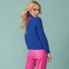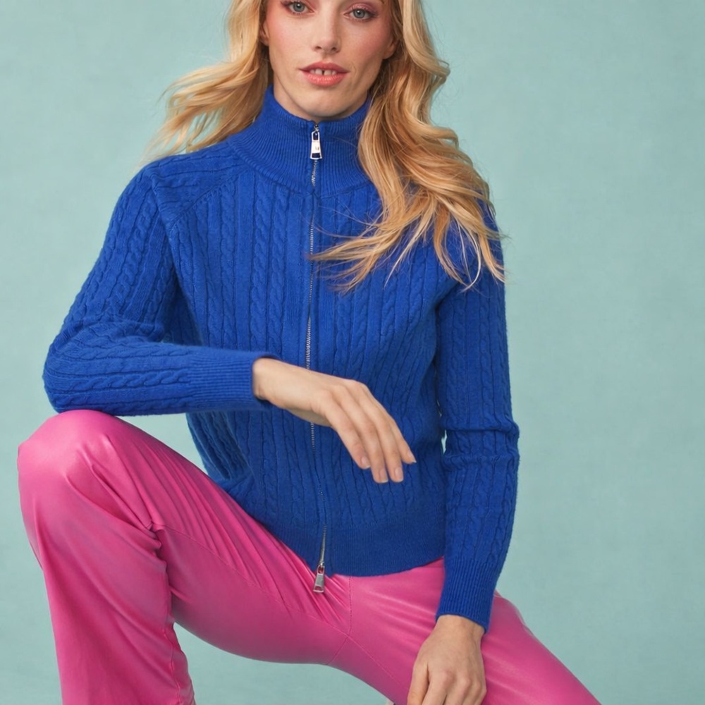This gorgeous banana peel zip cardigan is the ultimate in soft and cosy luxury.  In a beautiful cobalt blue cable stitch knit, with a high neck zip collar, that can be worn open or zipped to the top depending how the mood takes you.