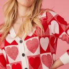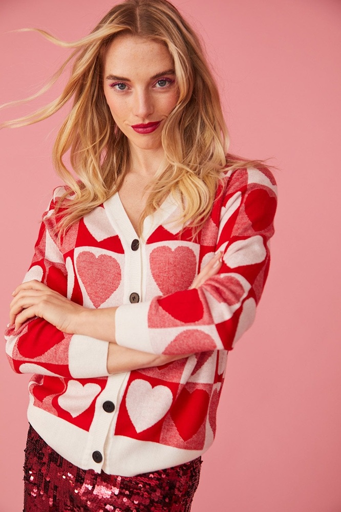 With a flat smooth finish, this banana peel heart cardigan features a pattern of large hearts in red and ivory reversed out of red and ivory checks woven into the intarsia knit and covering the whole cardigan.