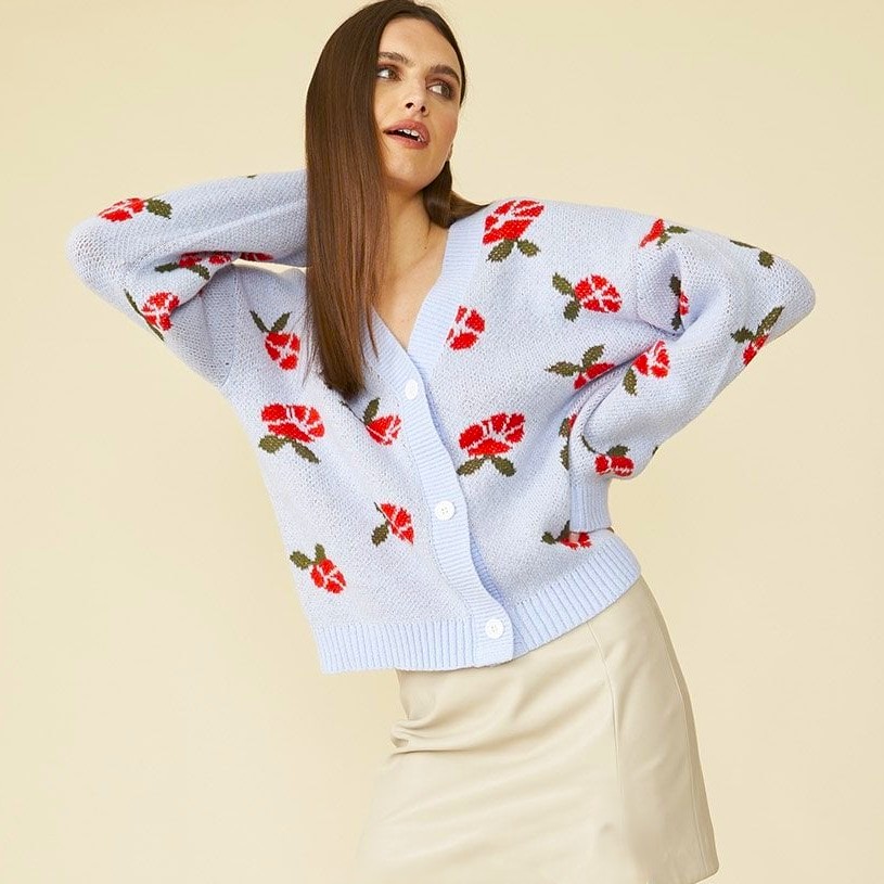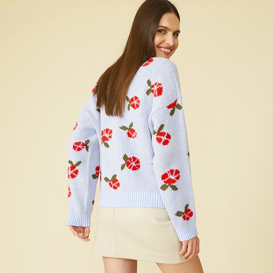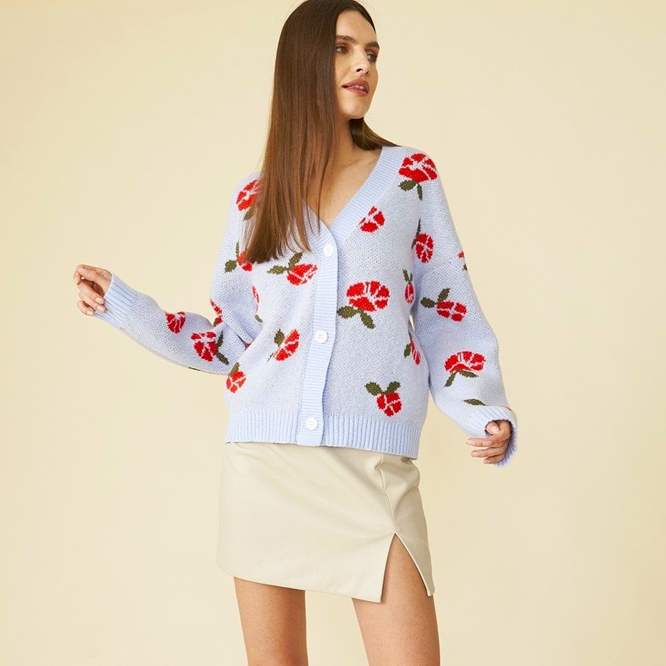 This cheerful banana peel rose cardigan is a little bit of early spring. Just the thing to embrace a new season, whilst still being comfy and warm. The bright red roses accented with a green leaf woven into the powder blue background are so cute and add a little pop of colour to the whole piece.