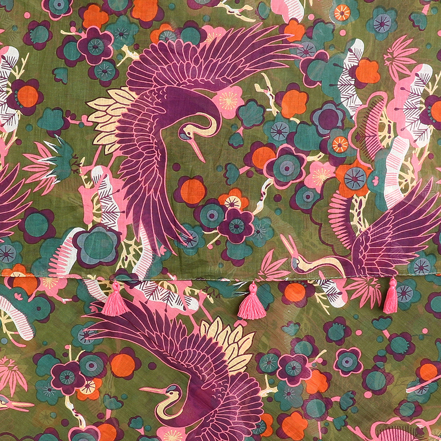Cranes are widely considered to symbolise good luck, happiness and peace, making this striking print even more appealing. The purple cranes sweep across an olive background, with delicate floral accents in pinks, coral and teal.
