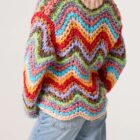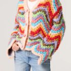 This handmade rainbow knit cardigan features a luxuriously long sleeve finished with a scalloped cuff, with a thick pale peach coloured knit edging that matches the curvy scalloped hemline. With a v shaped neck line and open front that fastens with large colorful wooly buttons. Some of the zig zag stripes are chenille, some are multicoloured and some have a delightful fluffy finish to them.
