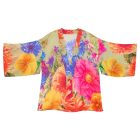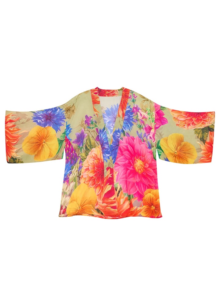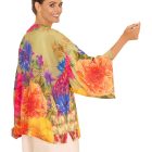 This shorter length kimono jacket with it’s colourful print on a soft sandy stone background will become a wardrobe staple.  Perfect for all kinds of events and occassions, dressy or casual.