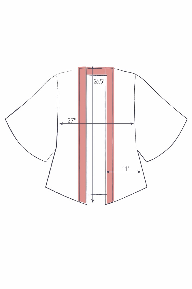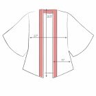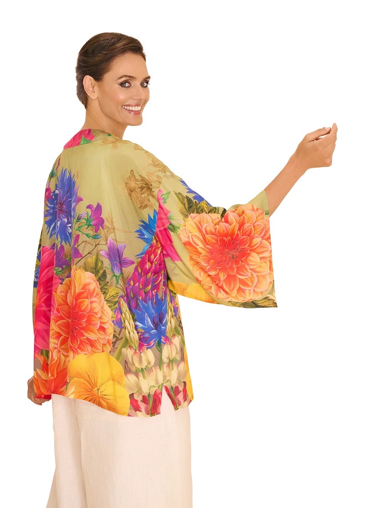 Featuring a flattering curve at the back neckline in a contrast bordered print that goes down the front of the jacket, two side slits for ease on the hip, a 3/4 length wide kimono style sleeve with a traditional underarm notch, which gives great freedom of movement and helps it stay in place – clever!
