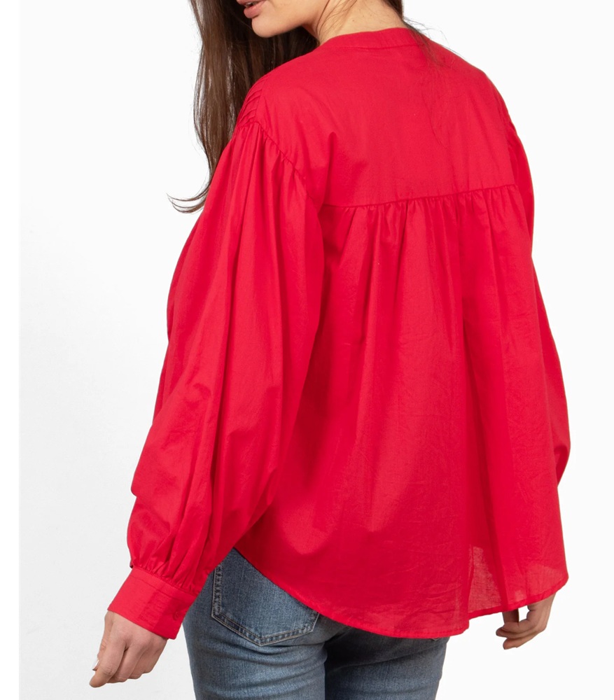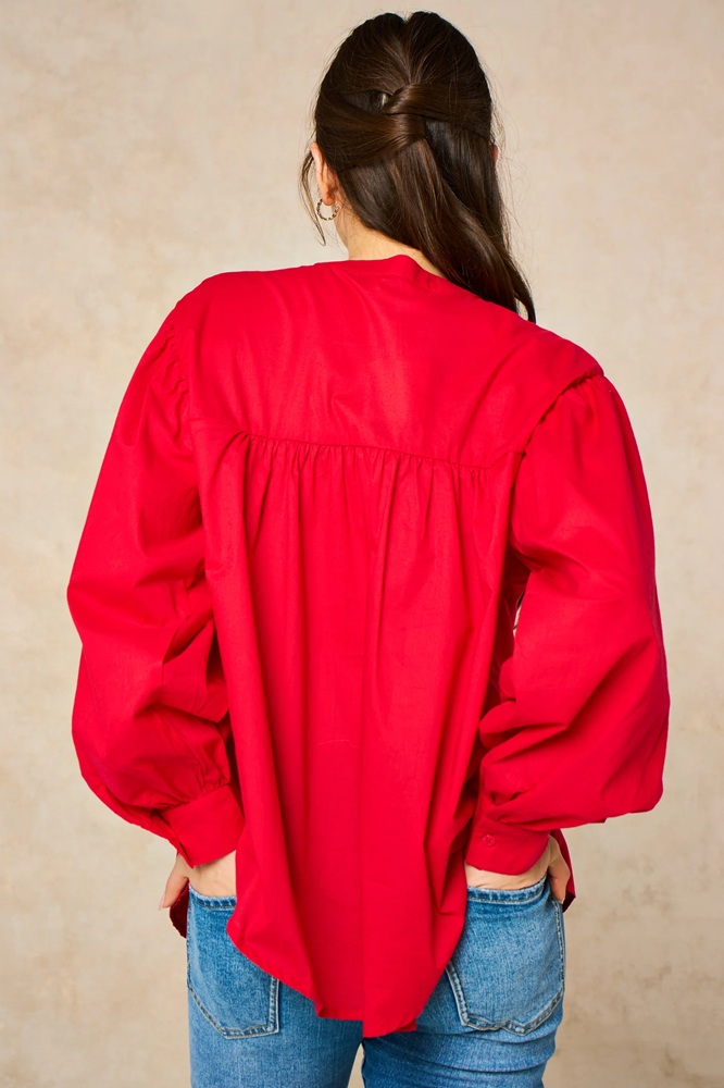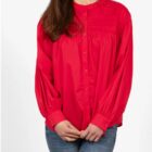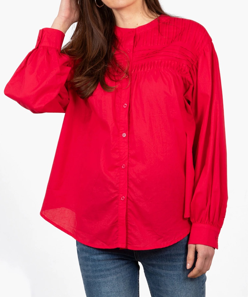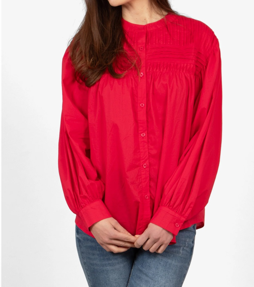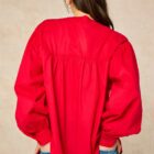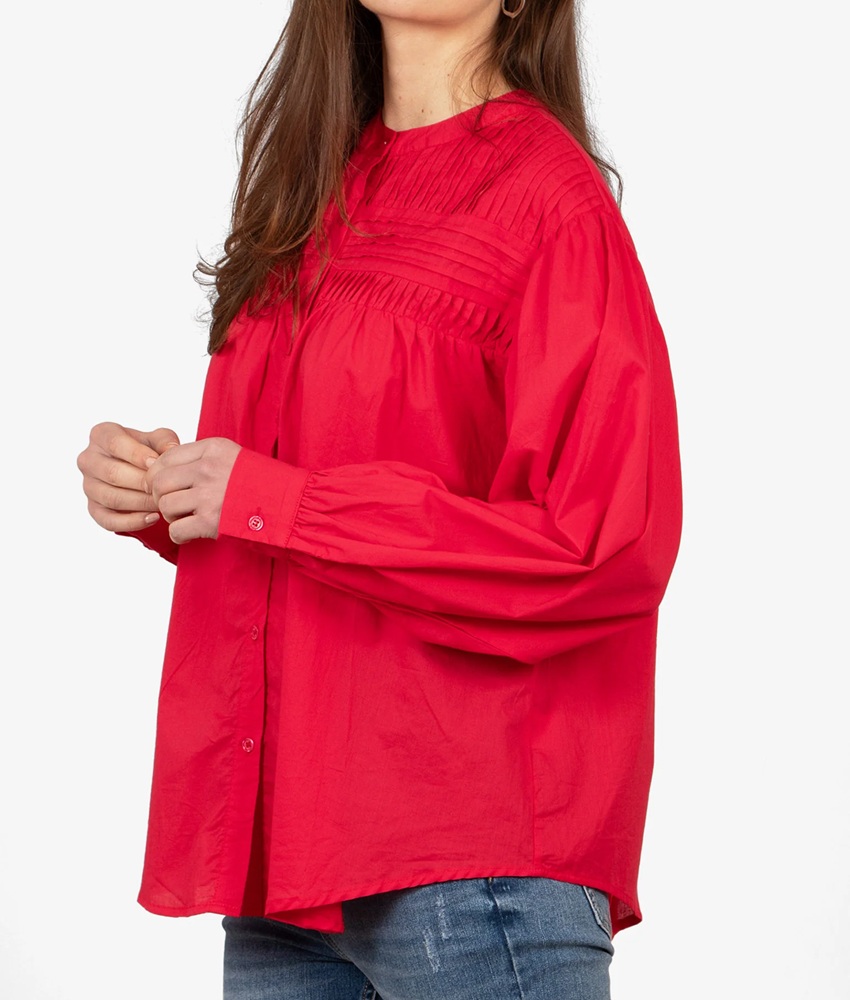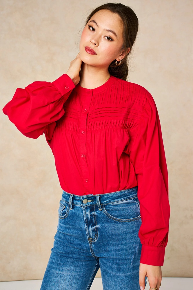 This striking red cotton pintuck shirt is a bold statement! It’s such a wearable piece as it can be styled in so many ways and can be teamed with a host of different colours.