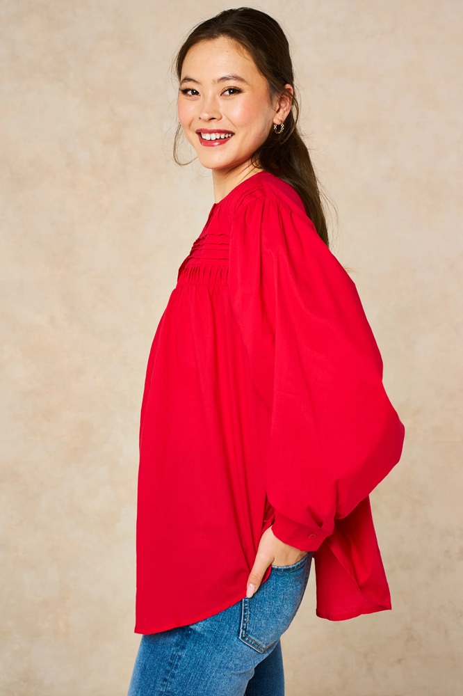 This red cotton pintuck shirt features an assortment of delicate pintucks on the front yoke, adding texture and detail to the smooth cotton finish. The round neckline is bound and closes at the top with a red button. The reverse of this shirt is gently gathered onto the back yoke, giving great volume and movement. With a flattering curved hemline, front and back.